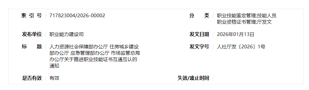 为贯彻落实党中央、国务院关于加快全国统一大市场建设、优化营商环境、促进高质量充分就业等决策部署,减轻劳动者技能评价取证负担,提升技能评价服务效能,现就推进职业技能证书(含技能人员职业资格证书、职业技能等级证书)互通互认事项通知如下。